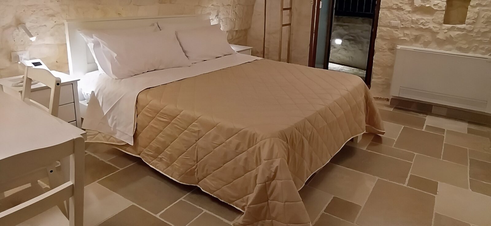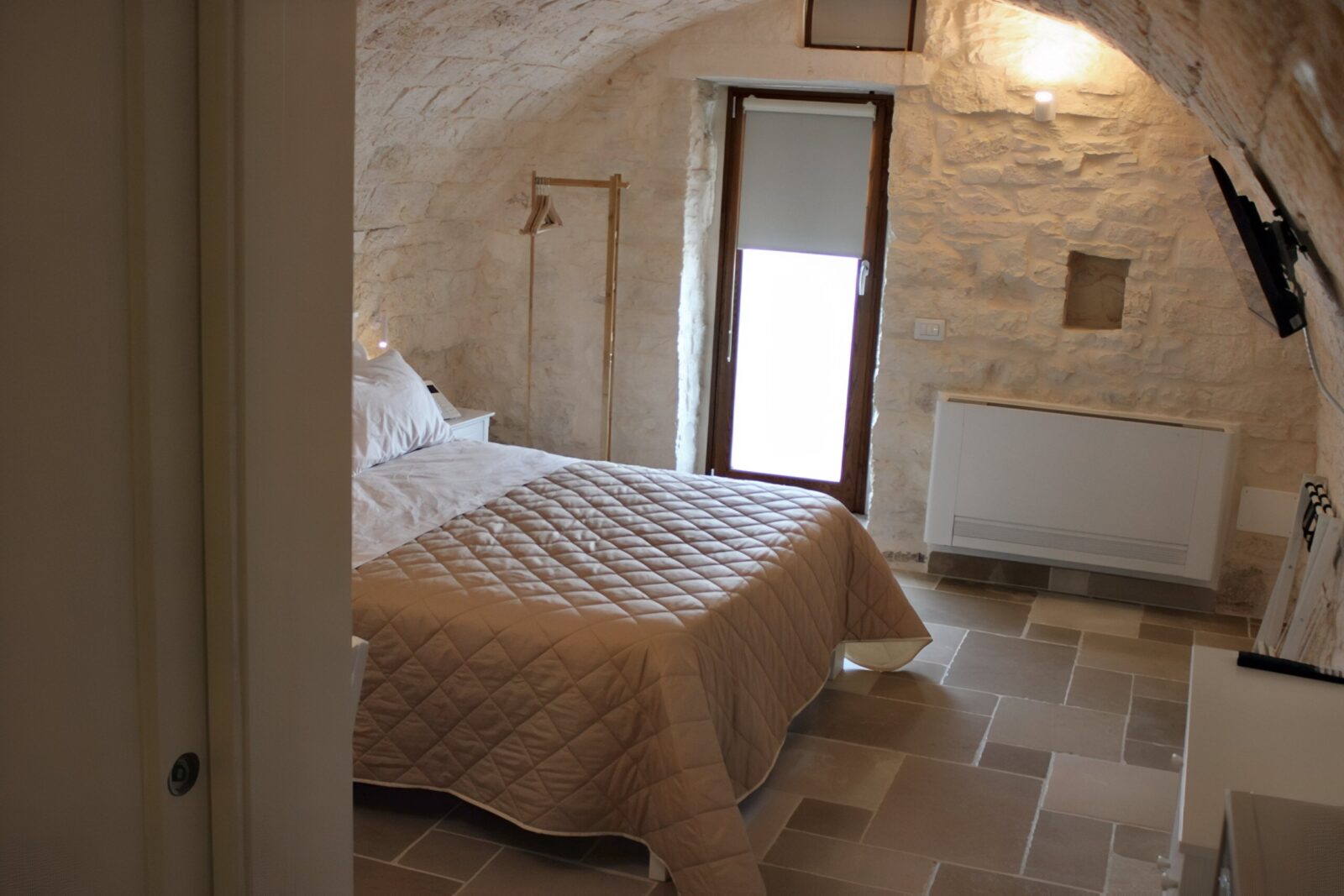 Incantevole camera con soffitto a volta a botte. Con accesso diretto al terrazzo, perfetto per godersi le giornate soleggiate. Arredata con un accogliente letto matrimoniale, bagno privato e connessione Wi-Fi gratuita, è progettata per regalarti un’esperienza indimenticabile durante il tuo soggiorno.